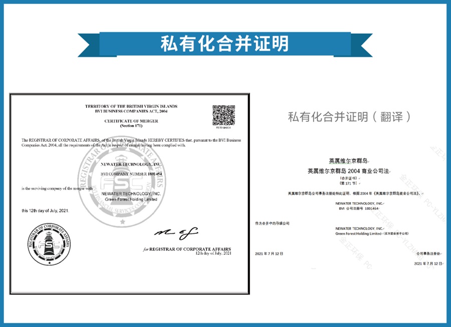 2021年7月12日,買方團(tuán)于BVI政府監(jiān)管部門完成對 NEWATER TECHNOLOGY, INC.的合并備案。