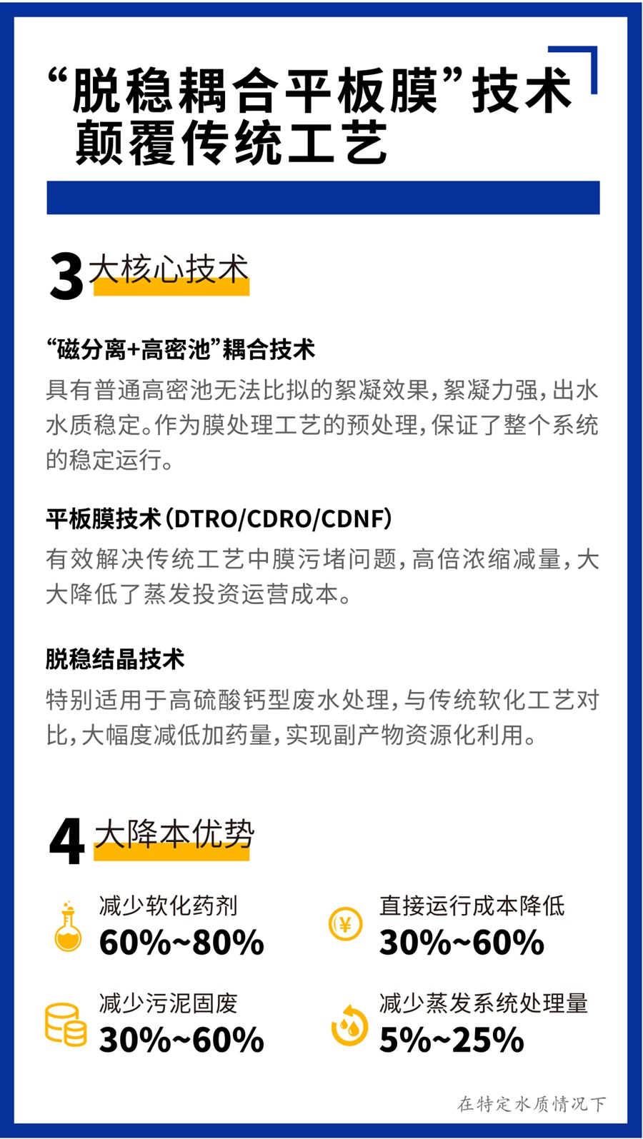 在某些工況下,采用“脫穩耦合平板膜”技術,減少加藥量,以更短的流程實現化工廢水的零排放,處理成本降低20%~30%。