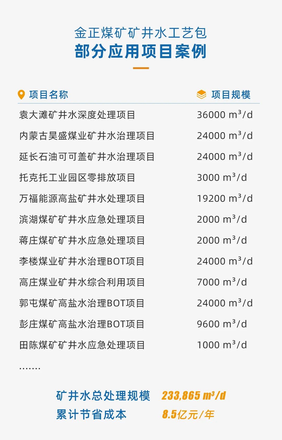 面對這一行業痛點,煙臺金正環保通過集成先進的預處理、脫穩結晶、平板膜技術、雜鹽資源化等先進工藝和設備,形成了中國人獨有的工藝專利技術。相比傳統化學軟化處理工藝,該技術藥劑用量減少≥80%、軟化污泥產量減少≥60%、去除硫酸鈣≥70%、相比傳統工藝處理成本降低≥60%,副產品二水硫酸鈣、硫酸鈉純度達到工藝一級標準,整體回收率高達95%以上。成功應用于煤礦礦井水深度處理項目中,實現經濟效益、社會效益和環境效益的多贏。目前,該技術榮獲山東省專利獎一等獎,在美國、澳大利亞等多個國家獲得專利授權,徹底解決“卡脖子”難題。